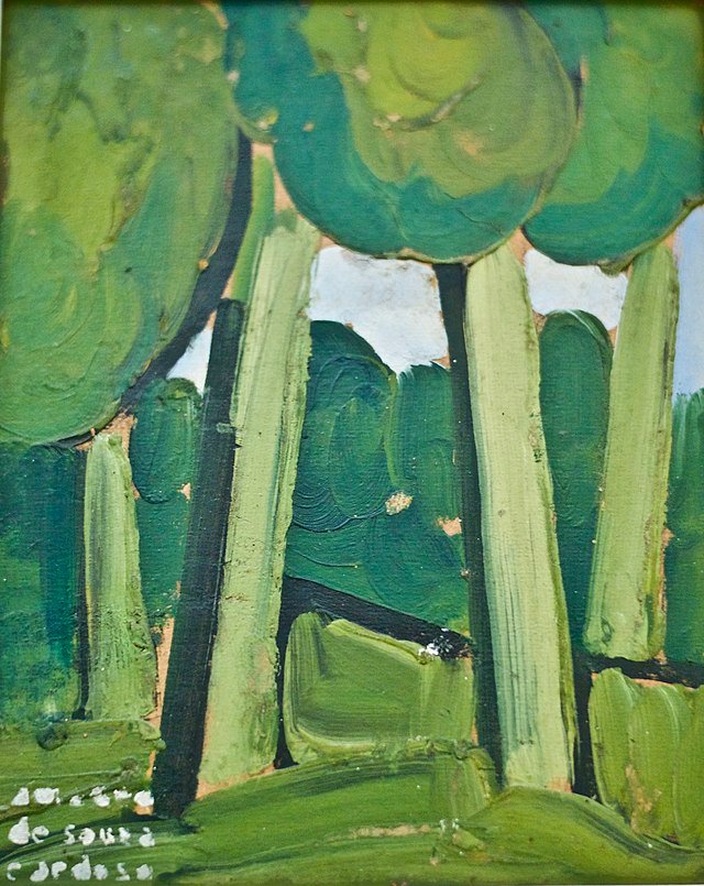 Despite its modest size, Green Landscape carries symbolic weight. Created around the time Amadeo resettled in Portugal due to WWI, it may represent his reconnection with the Portuguese countryside – the green hills of home that contrasted so sharply with Paris’s urban bustle. The almost monochromatic green palette evokes the intense greenery of Minho (the northern region famous for its “green wine”), where Amadeo wandered. In simplifying the scene to basic forms, Souza-Cardoso shows an affinity with Expressionism and even hints of Fauvism (the bold use of non-natural color). Yet the mood is calmer than the wild Fauves – here greens are harmonious, layered in serene tonal variations, creating a meditative rhythm of tree shapes. The painting contains virtually no sharp angles or broken facets as seen in his cubist works; instead, it’s all curved organic shapes, suggesting softness and growth. This reflects another side of Amadeo’s art: he could be fiercely avant-garde, but he also had a poetic sensitivity to nature’s simple motifs. In Green Landscape, the folkloric influence is subtler than in his collage works – it lies in the choice of subject (a quiet forest scene typical of northern Portugal) and in the honest, almost naive directness of the depiction. At the same time, the piece remains thoroughly modern in execution: the flattened perspective and the freedom of the brushstrokes (not blending or shading realistically, but laying down pure fields of color) align with contemporary trends in European painting. We might consider Green Landscape a small homage to his roots – a piece that “contains what the artist felt to be his: a natural landscape but also a mental one.” It’s as if Amadeo distilled his memory of Portuguese forests into an abstracted memory-painting, using green not just as a color of leaves, but as a symbol of life, renewal, and homeland.