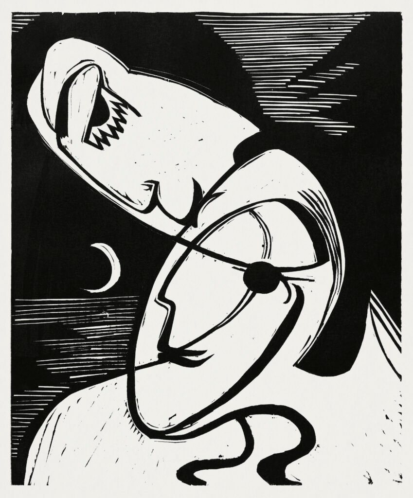 Two crescent profiles fuse into a single white emblem against night-black. No crowd, no city—just curve, breath, and silence. Late Davos prints compress emotion to essentials; the chisel writes a lullaby. Multiple impressions exist (Kirchner Museum Davos; National Gallery of Art).